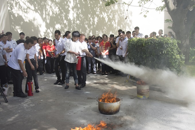 二、讓全體(ti)員工聚集在一起,演示了防毒面罩、消防水袋及干(gan)粉滅火器的(de)使用方法。
